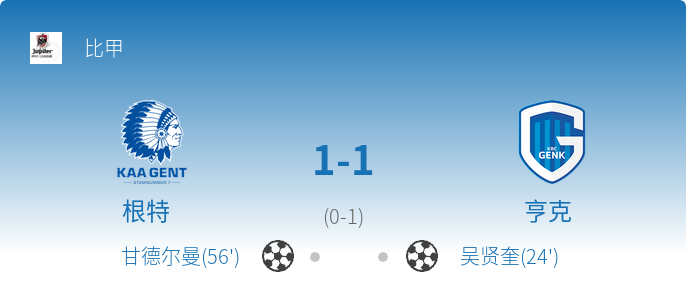 比甲第14轮:根特主场1-1战平亨克,双方激战90分钟难分胜负